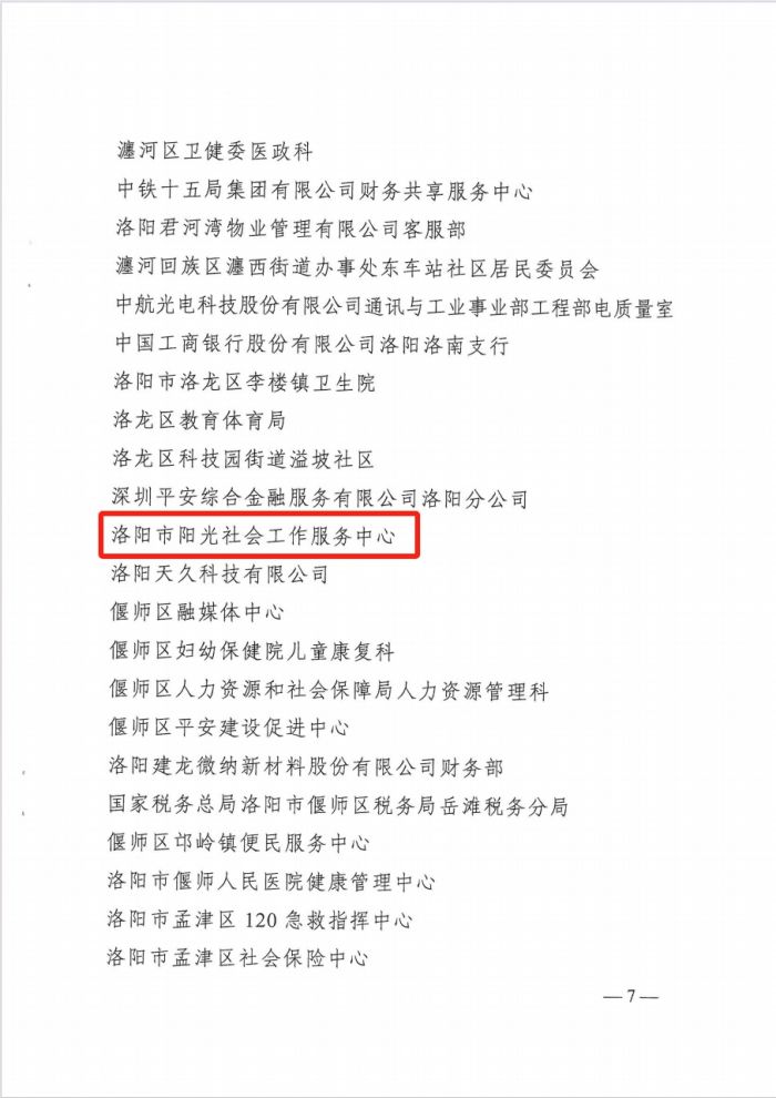 2024年1月9日,为表彰先进、树立榜样,进一步引领和激励广大妇女坚定不移听党话、跟党走,洛阳市妇联决定命名150个单位为洛阳市巾帼文明岗,150人为洛阳市巾帼建功标兵,其中洛阳市阳光社会工作工作服务中心荣获2023年度洛阳市巾帼文明岗。