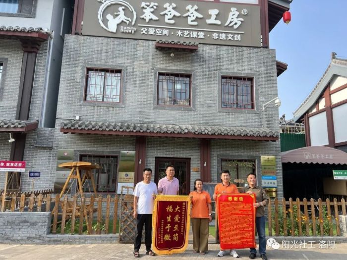 2023年8月10日,伊滨区寇店镇五龙社区驻村书记孙劲旭一行到笨爸爸工房向阳光社工捐赠荣誉锦旗及感谢信,以此感谢阳光社工在五龙社区安全家园项目中所做出的努力。