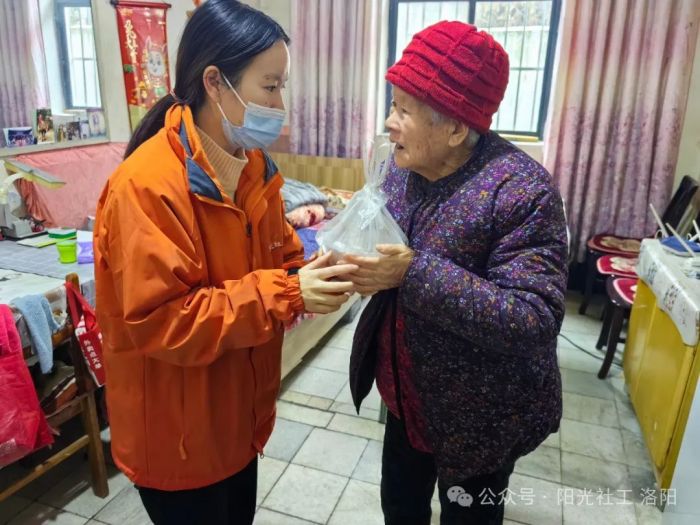 考虑到最近下雪,天气寒冷,有一些老人距离较远腿脚不便,社工们结束餐厅工作后便兵分两路,一组针对辖区内的孤寡独居老人,将打包好的腊八粥送到老人家中;另一组人带着保温桶前往交运家属院门口,招呼居民就近盛粥,大娘端着腊八粥,开心地说:“这么冷的天,一碗暖暖的粥温暖了我们的心,很感谢大家。”